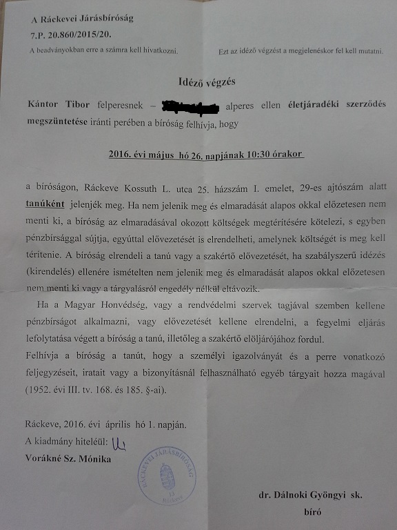 Múlt évben megkeresett az utcában egyedül élõ, idõs "szomszéd", akivel egyik "jóakarója" életjáradék-szerzõdést kötött, de úgy tûnik, hogy a naiv elesett embert inkább "mérgezték" és a megegyezett összeget sem kapta meg, cserében ügyvéddel átíratták a házát, telkét a másik félre. Próbálok neki segíteni, de ugye nagy valószínûsége van annak, hogy a két tárgyalás pont egy napra essék!