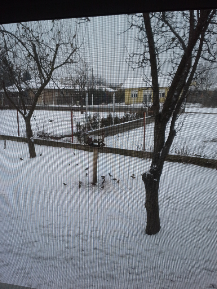 Vagy 30 kg. takarmány ment el ezen az enyhe télen, de ideszoktak már évek óta és egyre többen lesznek. Most is vagy hat fajta-féle (meggyvágó, erdei pinty, cinege, zöldike...) látogatott el reggelizni.