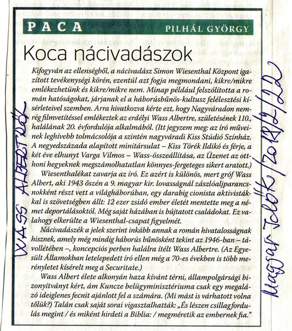 Nem tudok másra gondolni, mint arra, hogy valakiket nagyon zavar Wass Albert egyre növekvõ népszerõsége, és úgy kíván ellene harcoln , hogy cioinistának állítsák be õt.