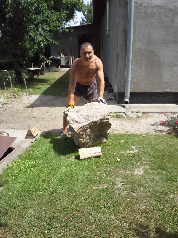 Mormota, ezt jó pár éve, úgy 13 is van már, még talicskába tettem, de mostanra megadta magát a tajiga, így kénytelen voltam görgetni. Saccolni tudok, ez olyan 180 kg-os lehet, de a kertben ez közepesnek számít. Tavam nekem is majdnem lett, annyi esõ esett és éppen azon vagyok, hogy ne legyen, tehát vízelvezetés ezerrel, közben pedig azt a rengeteg követ beépíteni végre a helyére.