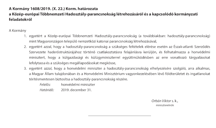 Amennyiben ez még nem lenne elég nagy hazaárulás 1608/2019 Határozat (X.22!),- ezen a héten kedden(!),- megegyeztek a magyarság nevében nyilatkozók(!), hogy Magyarországra telepítik a "Közép-európai Többnemzeti(!) Hadosztály Parancsnokságát....