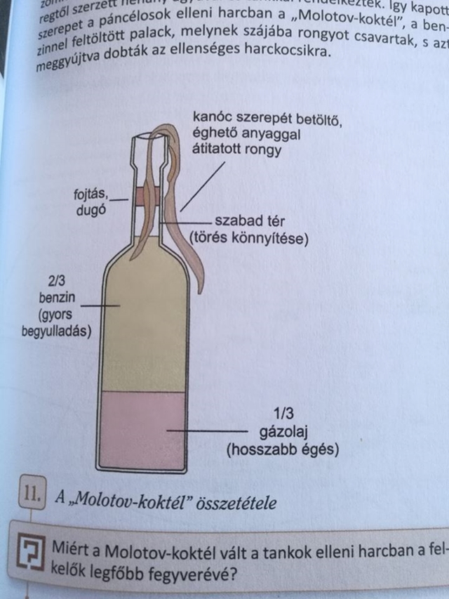 Így kell ezt! Figyeljetek, mert készül a "zombi-béke". Remélem a robbanós mellény, kés-technikák és egyéb harcászati kiképzés is komolyodni fog. Méghogy én vagyok a militarista szekta! Akkor ezek mik? A Molotov-koktél teljes „receptje” szerepel a 12. évfolyamosok történelemkönyvében – szúrta ki egy szülő.Egy szülő, aki a Facebook-oldalán tette közzé a fotót, azt írta a bejegyzésében: „eldobtam az agyam a gyerek törikönyvén”.