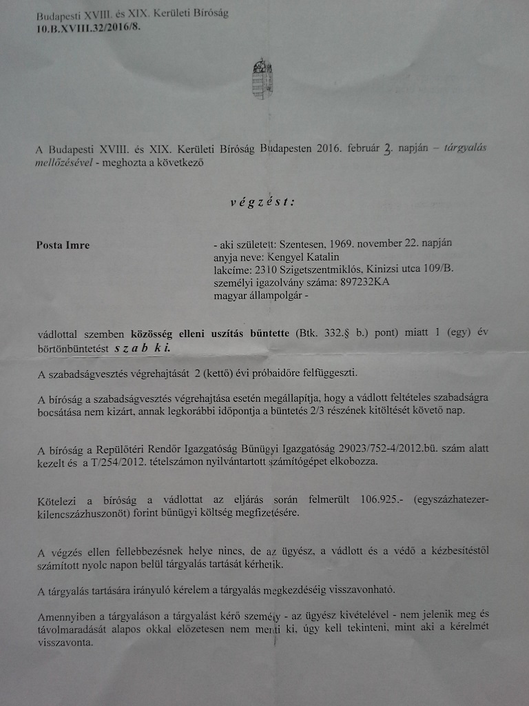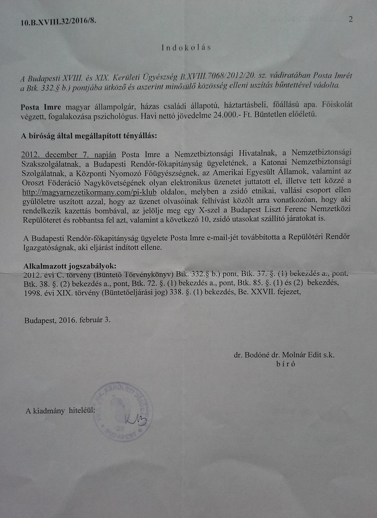 A bírósági végzés szerint a BRFK Posta Imre e-mail-jét a Repülõtéri Rendõr Igazgatóságnak továbbította, "aki eljárást indított ellene".