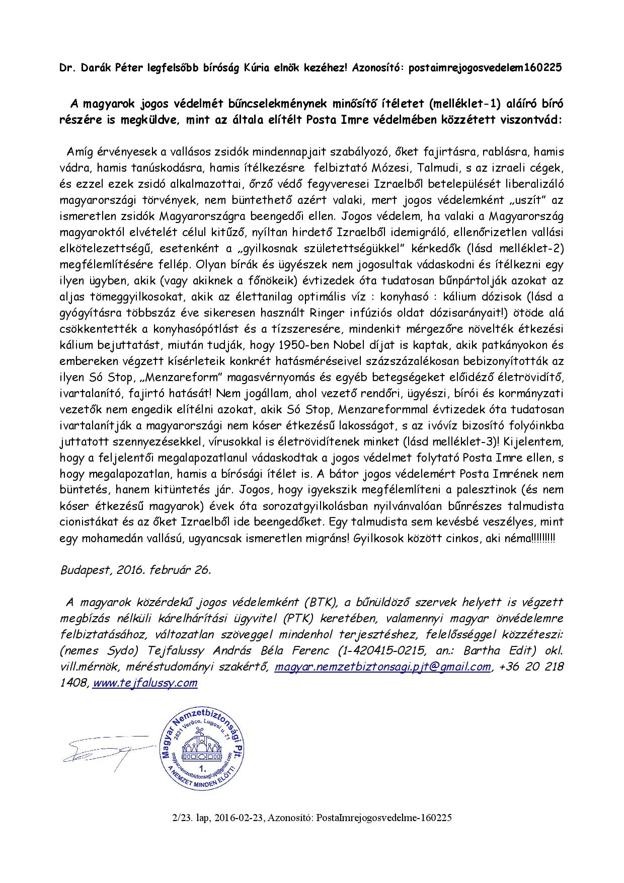 Imre! Ezeknek végük! Nem nyúlhatnak hozzád, mert töménytelen mennyiségû anyag áll a rendelkezésünkre, ami a magyarok szisztematikus kiirtására vonatkozik. Rengetegen állnak mögötted. Elég volna csak kiplakátolni az állítólagos nemzeti politikusaink kipás fotóival az egész országot, zsidók társaságában, mellette az ország eladását bizonyító szerzõdéssel, vagy azzal a fenti szöveggel, ami itt fentebb is szerepelt Magyarország és Galícia elfoglalásáról, elvételérõl a magyaroktól és más velünk élõ nemzetiségiektõl. Ettõl fel kellene hogy ébredjen mindenki és akkor Orsósnak már nem azért kell félnie a lámpavasra akasztástól, mert négereket és arabokat telepítene le az országban, akik a zsidókra is veszélyesek volnának, hanem azért, mert izraeli, amerikai és még ki tudja honnét származó zsidókat telepítenek befelé, valami letelepedési kötvény segítségével is, nem csak a migráns áradat leple alatt.
