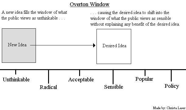 Az Overton ablak valójában egy politikai elmélet, aminek a lényege az, hogy az emberek politikai döntése sokkal inkább múlik egy bizonyos intervallumon (ablak) belüli értékeken, mint a politikus személyén. Következésképpen ezt az intervallumot (ablakot) kell eltolni, nem elég egy népszerû politikust az adott ügy mellé állítani."Link